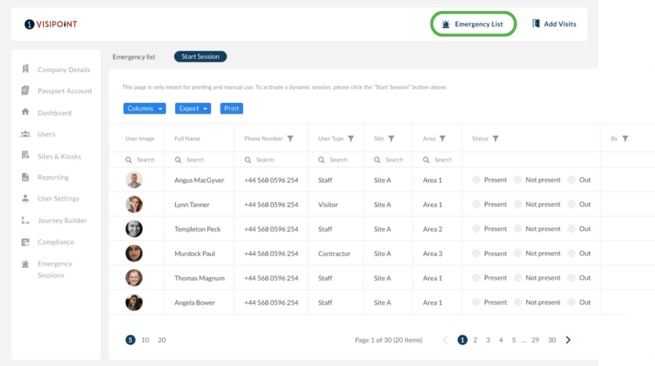 The emergency list feature generates a list of all users (visitors, staff, contractors etc) currently signed in to your facilities so you can respond faster in emergency situations with an accurate and real-time list of the individuals who need to be accounted for.